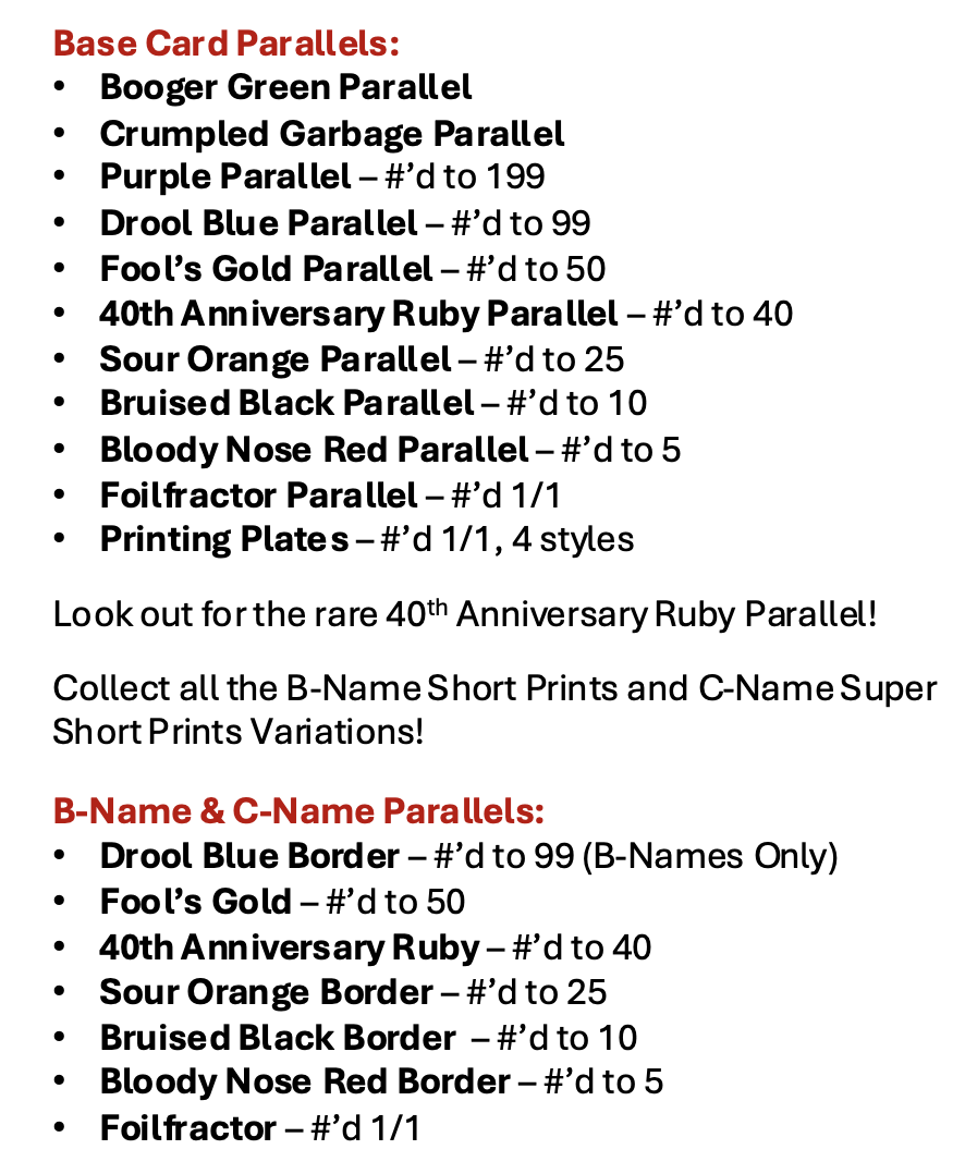 The Basics: A typical pack of this one will include four character cards and one Booger Green parallel. A box will include at least two serial-numbered cards along with the base cards and hit. The full lineup of parallels is in the gallery for A-, B- and C-Name versions. ... Inserts will include Global Takeover (iconic characters in another language), GPK Eras (character debuts), Wacky Packages: GPK Boxes and Homage To Garbahj (Adam Bomb in varying styles) with those sets having Blue, Gold, Orange, Black, Red, Foilfractors and printing plates at same volumes as noted below. ... Hits will include artist autos, Homage To Garbahj autos and sketch cards with some penned by past GPK creators Tom Bunk and Smokin’ Joe. Autos will also have Blue, Gold, Orange, Black, Red, Foilfractors and printing plates.