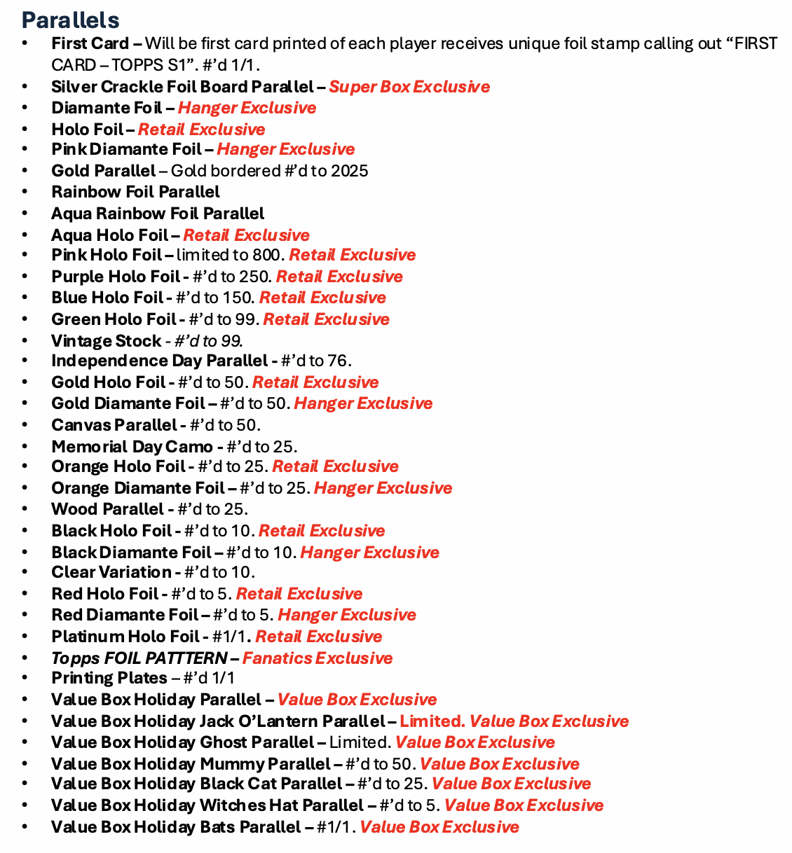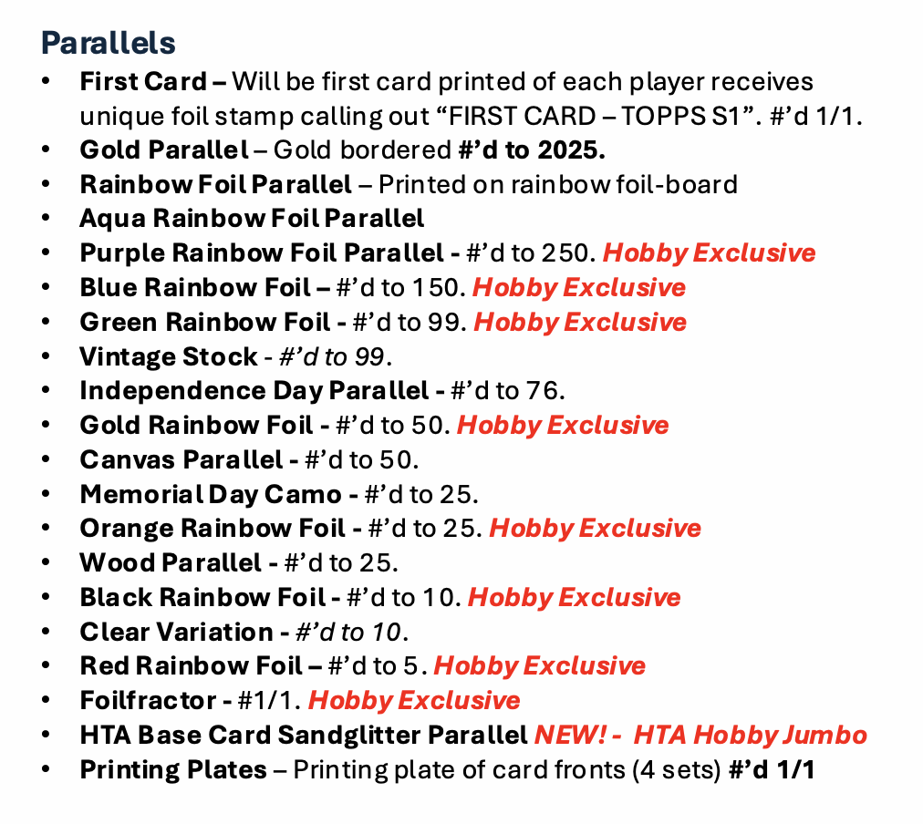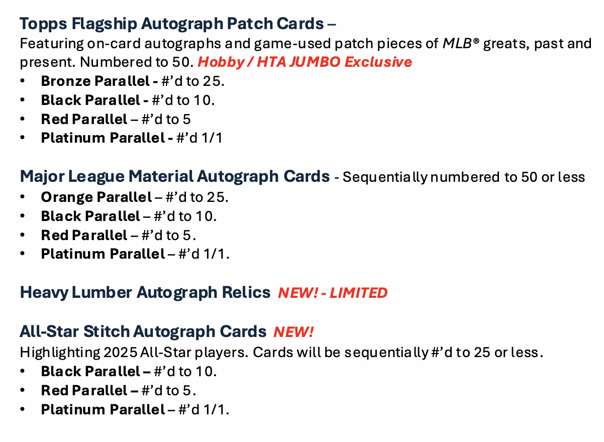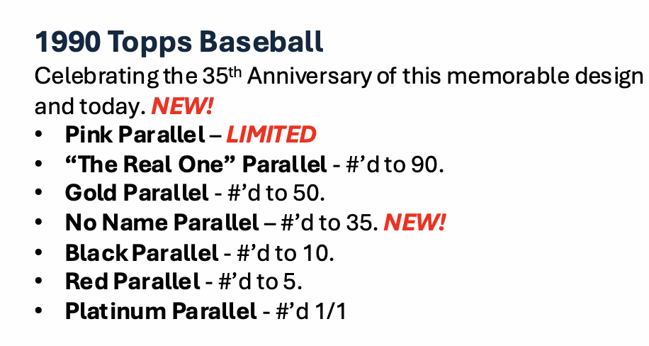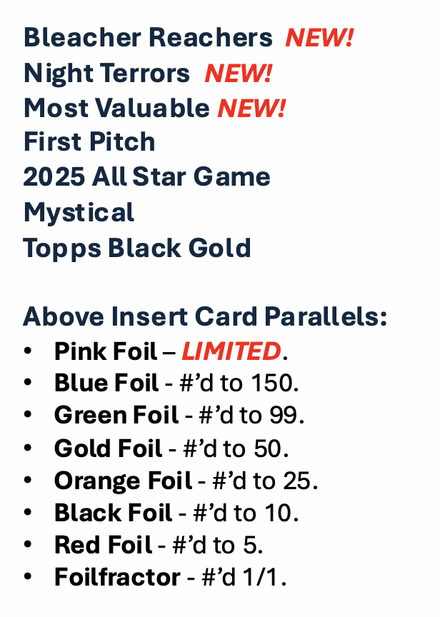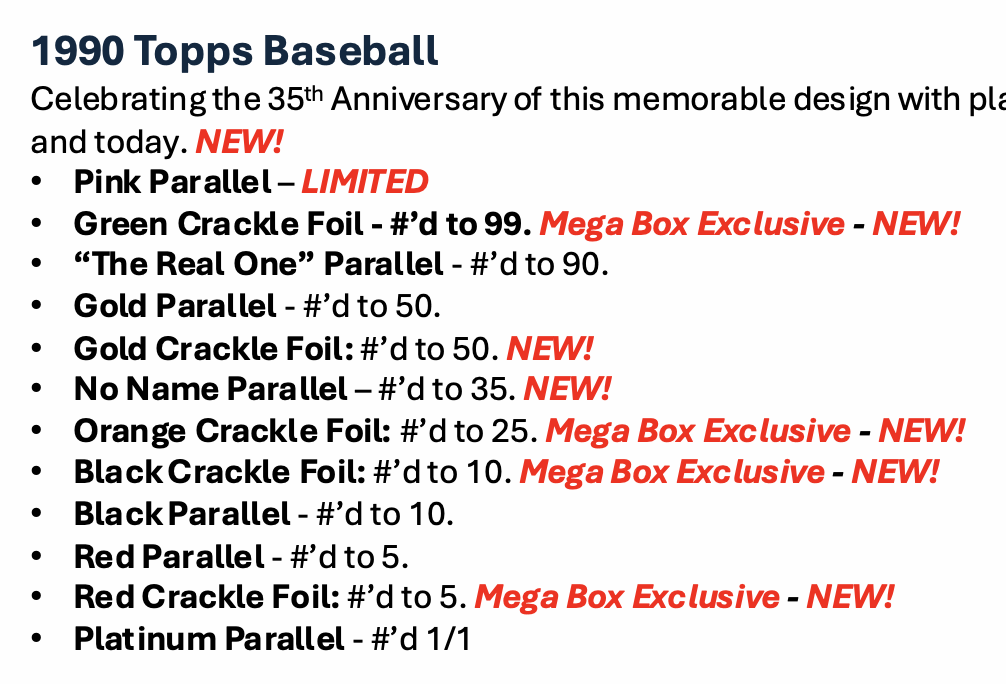Update (Sept. 29): There's some new info -- but still plenty more to come -- for this one with what's known so far is a 350-card base set "with a sprawling lineup of parallels" that will include Gold, 1/1 Foilfractors and a new wave of Holiday variations in blasters. Other inclusions are Mystical, MLB All-Star Game, Black Gold, First Pitch, Bleacher Reachers, Night Terrors and Most Valuable -- all with parallels. As with most years, this one will note All-Stars and highlights from this year's event, including All-Star Stitches Relics, All-Star Stitch autos and "a full foil rainbow of All-Star inserts." There will be another batch of 35th anniversary 1990 Topps inserts and autos and Keegan Hall art cards. Also in play will be Golden Mirror autos, Heavy Lumber, Homefield Advantage, Legendary Homefield Advantage, Stars of MLB and Stars of Japan.