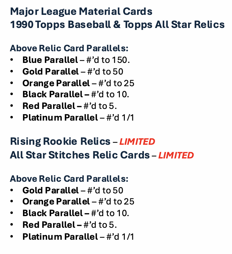 Box basics: One auto or Relic per 20-pack hobby box (12 per case) or one auto and two Relics per 10-pack jumbo box (six per case)