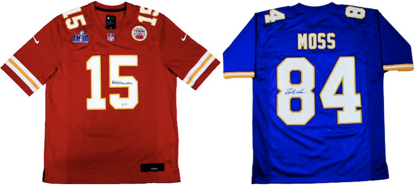 The Basics: Back is the "case chase" where there will be randomly inserted gold redemption certificates good for a full case of a Hidden Treasures product -- and that could include footballs, mini-helmets or signed jerseys. Odds for landing that are one in 750 boxes. ... The standard lineup here once again includes two Hall of Famers, two current players and one "football favorite" and, as always, all autographs are authenticated by TRISTAR, PSA/DNA, Fanatics, BAS or JSA. ... Among the teased names? Patrick Mahomes, Tom Brady, Randy Moss, Saquon Barkley, Drew Brees, Josh Allen, Peyton Manning, Justin Jefferson, Bo Jackson, Steve McMichael, Aaron Donald, Rob Gronkowski, Joe Burrow, Jason Witten, Baker Mayfield and Jason Kelce for starters. Some college jerseys will be in play here.