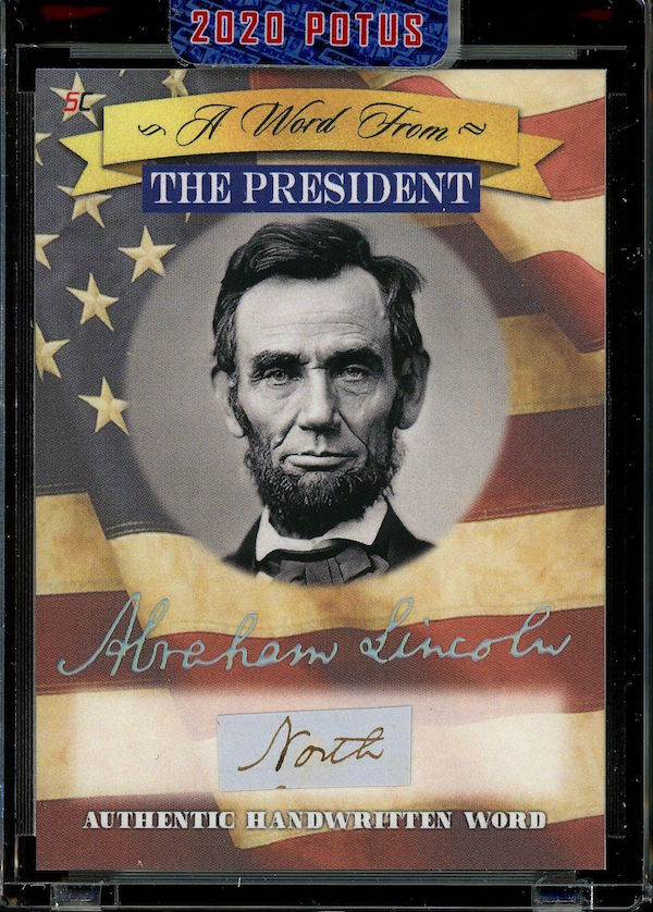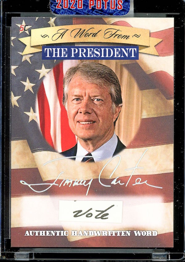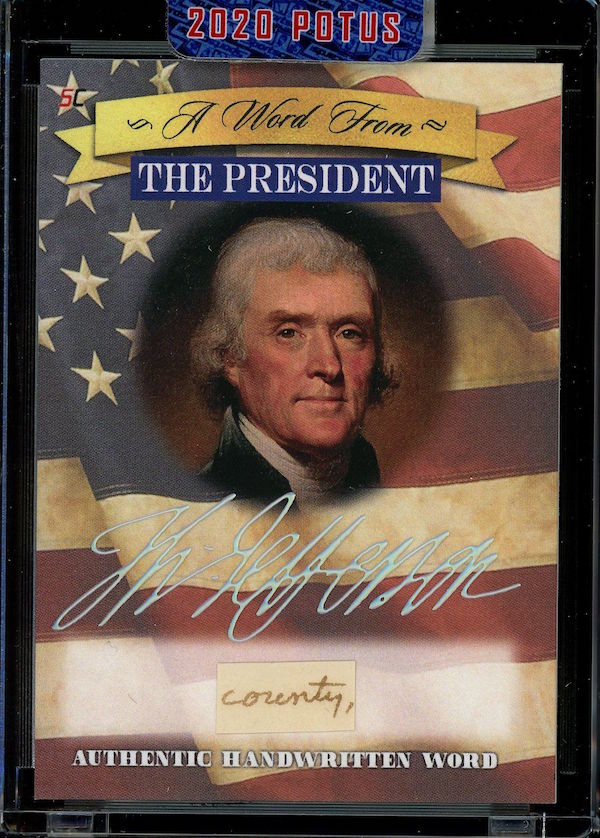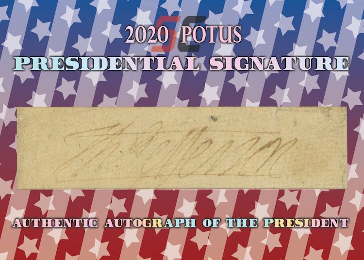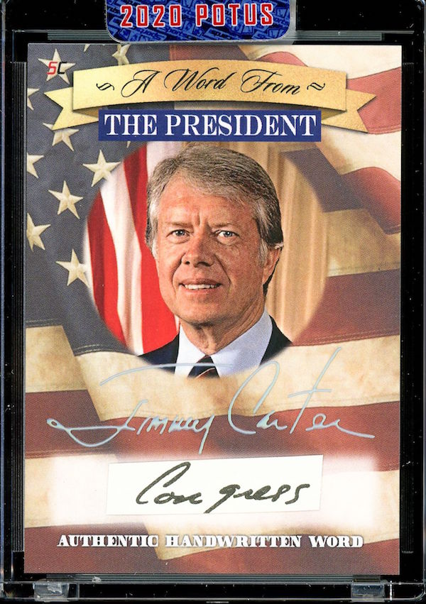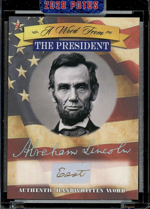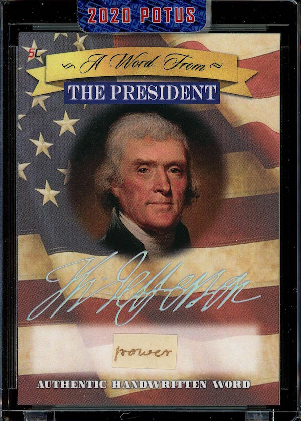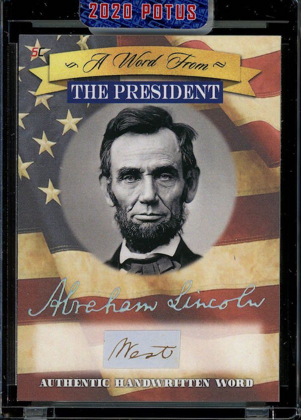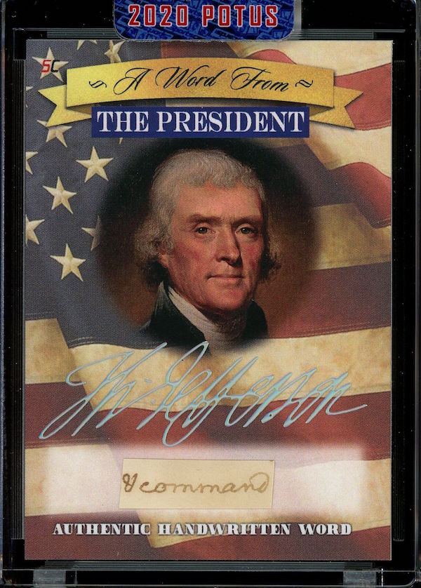 The Basics: All "A Word from the President" cards are cut from authenticated manuscripts and letters hand-written by each of them with autographs roughly one in every fifth display (every 50th mini-box). Relics are cut from documents that were handled by them and every 10-box display is guaranteed to include a "Word" card from George Washington, Thomas Jefferson, Abraham Lincoln or John F. Kennedy as well as a Relic card from one of them. All "Word" and signature cards will arrived in encased presentations. All documents were authenticated by PSA/DNA, BAS or JSA and full pieces can be viewed on www.sportscards.com/2020potus.