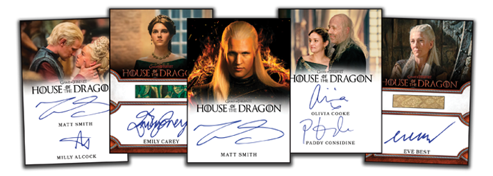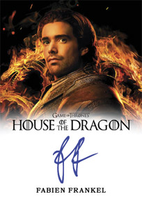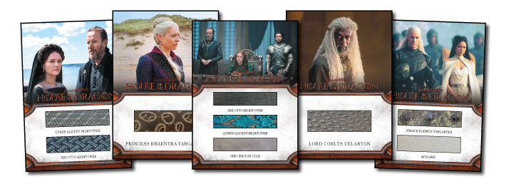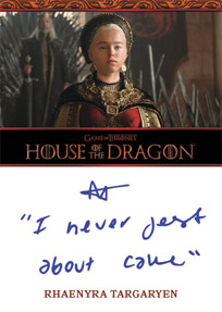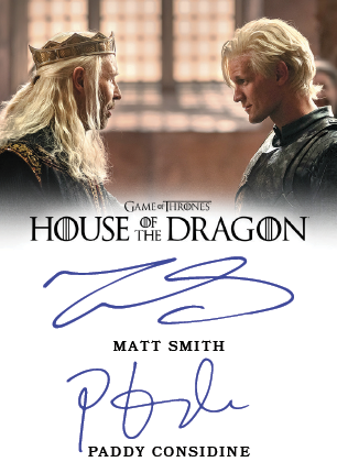 There also will be an album with a promo card as with traditional releases, while a case-topper card will be from a three-card Motto set. A bonus for 12-case buyers will include a dual-auto for Matt Smith (Prince Daemon) and Paddy Considine (King Viserys I Targaryen).