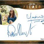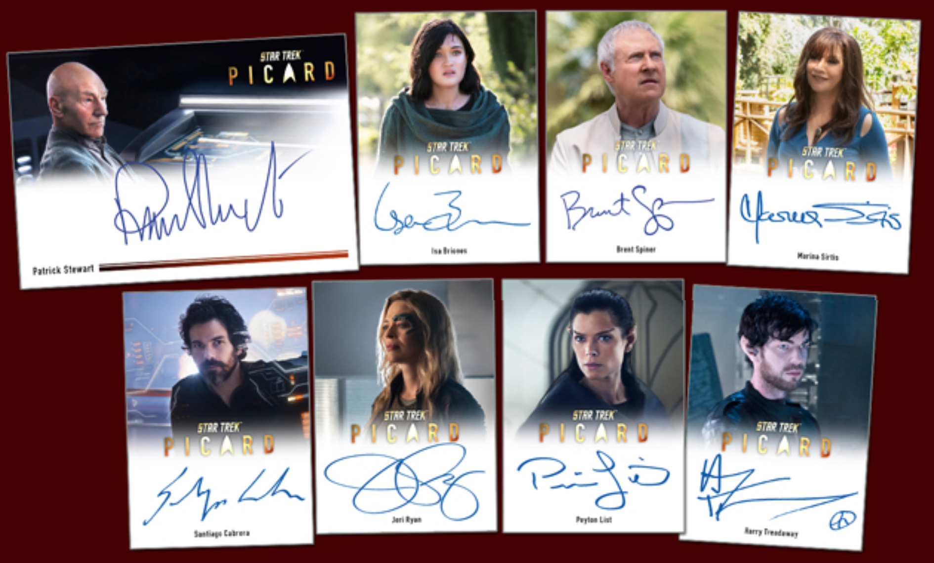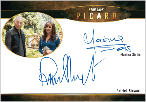 The Basics: Among the signed cards will be some key names -- Patrick Stewart, Brent Spiner, Martina Sirtis, Jeri Ryan and Jonathan Frakes for starters. (See everybody teased below.) The base set for this one will include 60 cards covering all 10 episodes for the first season. Among the insert sets will be Romulan Tarot Cards (32 cards), Characters (21 cards), Holocrew of the La Sirena cards (five cards), Casting Call (nine), Promotional Travel (nine) and 1/1 sketch cards. There also will be a Data's daughter painting case-topper and an album with promo card for collectors to grab. For bulk buyers, there are six-case, nine-case and 18-case incentive cards. The six will be a Jeri Ryan-Evan Evagora dual-auto card, the nine will be a Patrick Stewart-Marina Sirtis dual-auto card and the 18-caser will be an Archive Box that will include some extras such as auto variations and a printing plate set for one card.