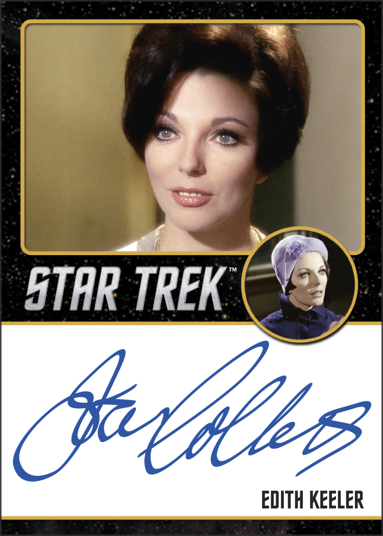 The Basics: The inscriptions autos (list below with gallery -- click for closer look) will include William Shatner, George Takei, Nichelle Nichols and Walter Koenig among others with one of this type of card in every box and a number of different inscriptions to be had. Joining them will be new Classic TOS autos that will include Shatner, Mal Friedman, Jay Jones and April Tatro among others, while cut autographs will be found for Arnold Moss and Angelique Pettyjohn.