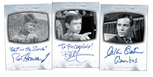The Basics: There will be 156 cards in the base set with one card per episode of the series, while there also will be insert sets with new artwork by Juan Ortiz for the 92 episodes either written by or adapted by Rod Serling as well as nine character art, nine Mirror/Mirror Cards, 18 Stars of The Twilight Zone cards and six opening monologue cards. ... Among the signers teased for this one are William Shatner, Ron Howard, Bill Mumy, Earl Holliman, Cloris Leachman, Morgan Brittany, Shelley Fabares, Michael Forest, Ruta Lee, Martin Landau, Ann Jillian, Nehemiah Persoff, Stephen Talbot, Barbara Barrie, John Considine, Jim E. Titus, Jim Houghton and Denise Lynn among others. There will be three inscription autographs per case. ... An incentive card for nine-case buyers is a dual-auto for Leachman and Mumy, while an 18-case incentive is an Archive Box that will include everything and a one-card printing plate set of four colors. An album also will be made with a promo card only found there.