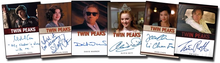 Stars of Twin Peaks: Limited Event Series, Then and Now, Music of Twin Peaks, Red Room Denizens, Pilot: Alternate Ending, Bookhouse Boys Patches and a Log Lady plastic card. A case-topper card will be a Double R Diner Specials Menu card.