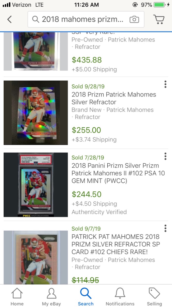 It's a 2018 Panini Prizm Patrick Mahomes II (silver) Prizm parallel, and, most importantly, it was a $50 card on eBay on Sept. 7.