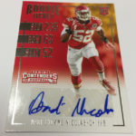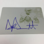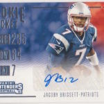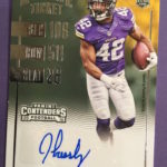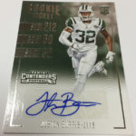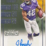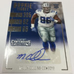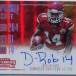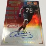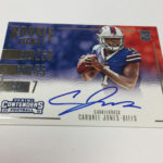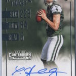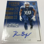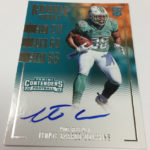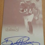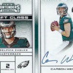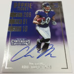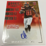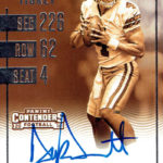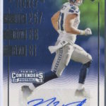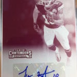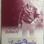 Each hobby box of Contenders includes at least five autographs and plenty more with some new looks in store for the autos like the horizontal design seen above. Hobby boxes also will include code cards for digital sigs on the Panini Gridiron football card app -- a new twist that could add some oomph to boxes.