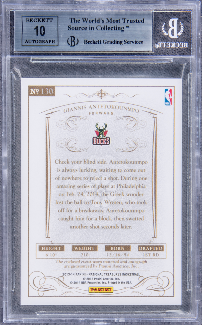 A 2013-14 Panini National Treasures NBA logoman of "The Greek Freak" -- the reigning NBA MVP Giannis Antetokounmpo -- commanded some big money in bidding action via Goldin Auctions on Sunday night.