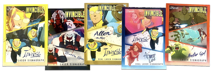 Also made for the show were Laser Signagraph /100 or less mystery boxes with every one of them including one hand-numbered Signagraph limited to no more than 100 copies. Also made was a standard Laser Signagraph mystery box including one card limited to no more than 500 copies with triple-sig cards for Invincible, Omni-Man and Battle Beast with an "ultra-rare" SP variant con-exclusive only in there, too.