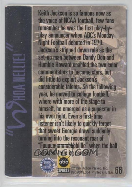 Back in 1994, Action Packed included Jackson in its Monday Night Football boxed set, a 71-card release that included cards of Don Meredith, Howard Cosell, Frank Gifford, Brent Musberger, Lynn Swann and Jackson -- the announcing teams that had helped bring the festivities to life -- along with stars of the time.