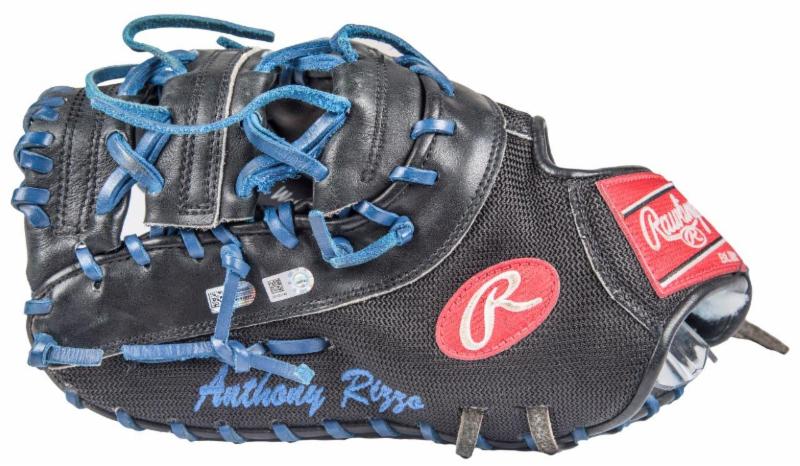 "Anthony Rizzo’s historic glove, which caught the final out of the game, is all black with blue laces. His left-handed Rawlings PROCMHO model glove is 12 ¾ inches with 'Anthony Rizzo' embroidered in blue along the outside of the thumb. The Rawlings’ trademark 'R' red patch is affixed to the lower outer thumb and the red 'Rawlings EST 1887' patch is sewn on the outer wrist. Rizzo has signed his name in silver marker on the palm and inscribed '2016 World Series Game Used' and 'Game 7 last out.' The glove displays heavy game use with dirt stains on the palm and lower webbing and abrasion marks on the outer laces. This glove comes with an MLB Authenticated hologram (JB000741) and has been designated as 'player-collected item.' It was collected from Rizzo on Nov. 4, just two days after the World Series. Additionally, there is a hologram from Fanatics (AA0002869) which authenticates the game use and Rizzo’s signature and inscriptions."