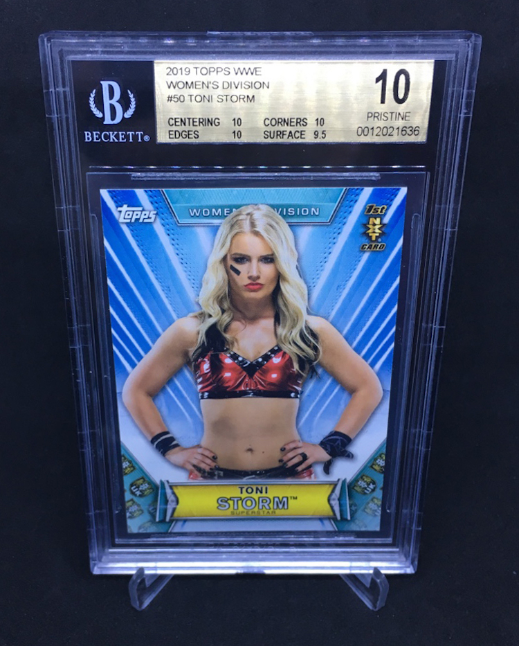 The Reason Graded: This Australian star -- via NXT UK -- really hasn't gotten to the premier levels of WWE just yet but her first autographed card in last year's NXT set (her only ones so far) was one of the pricier sigs in all of WWE lately. With that in mind, I had this first card on my grading radar and figured I'd get ahead of the curve and get one of my many copies of this basic RC slabbed. (Grading more WWE RCs is something I want to do more of.)