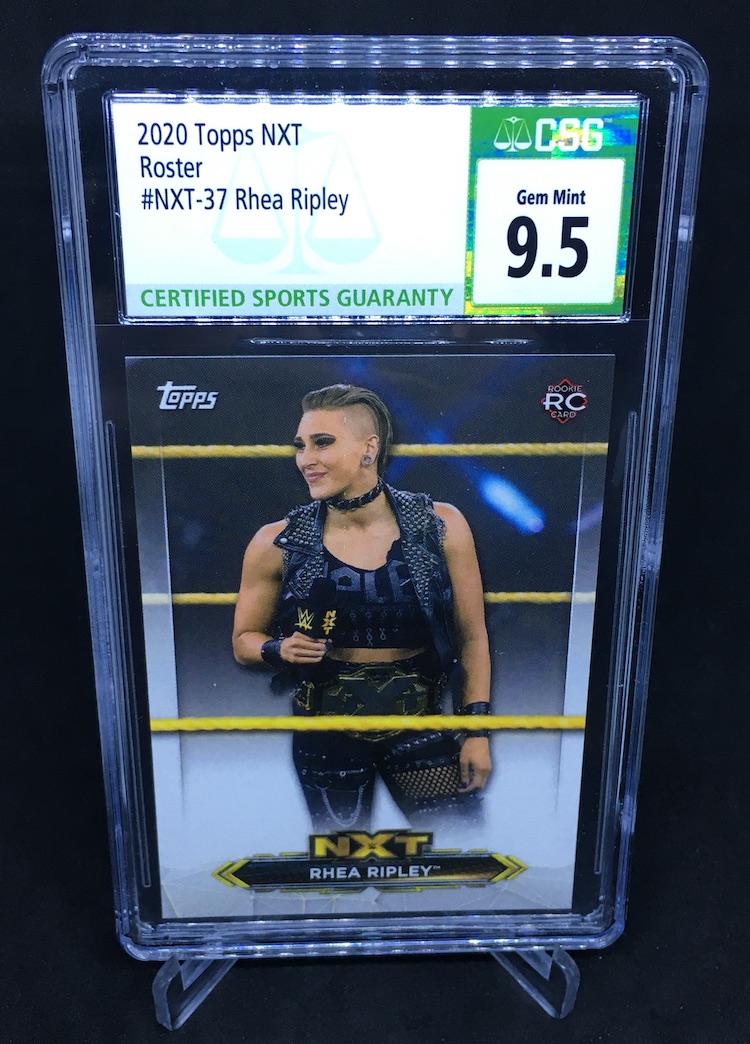 Reality Check: This one checked in where I had hoped -- and thanks to their new shift to a "Gem Mint 10" scale this one would be a 10 if in a new slab. (I'm good with that, too.) Flair isn't my favorite of The Four Horsewomen of NXT but I think this is one of her better cards ... though I do wish she would have signed in blue like everybody else.