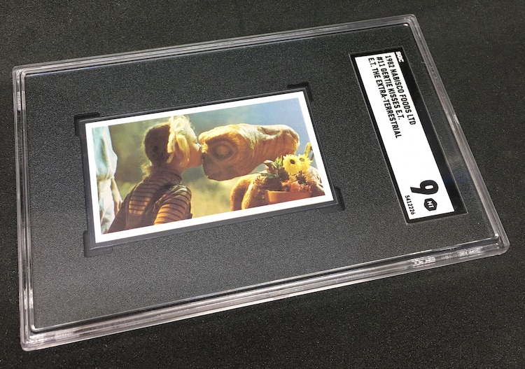 The Reason Graded: I think I have a mild Drew Barrymore problem as I have been picking off cards and other stuff to grade and this is an example from what was essentially her entrance into mainstream pop culture. (Though she did have other roles before.) Why? There's a lot to find with with a life spent in film and the spotlight and I remember this movie being one where I was first exposed to the toys and merch ... I think I was in kindergarten at the time. (Ironically, I remember I fell asleep before the movie ended when I saw it at a drive-in ... yes, a drive-in.) There are Topps cards and stickers for this landmark film -- many with the same images -- but the cards are very hit and miss for the stock and printing quality (it was 1982). Meanwhile, the stickers are on thin paper and are also at times challenges if you're daring pondering a slab. In this case, this oddball food issue -- and it's extra odd as these are smaller almost tobacco-style size cards -- caught my attention as it really looked cleanly made and wasn't expensive considering how these are a lot more obscure than the Topps stuff.