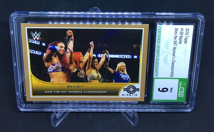 The Reason Graded: This slab's label is all kind of botched as it was in an early CSG sub -- it's missing both the full name of the set as well as its status as a Bronze parallel. (It's not in the pop report* either.) But that's OK as I also own the other copy of this one that was more recently graded. (I'll pop it up here at some point soon.) Why do I have two? I dig it as this is a big moment for WWE's Four Horsewomen who have helped change the game in the last decade. At this point, Bayley got her run with the NXT title -- the last of the four to do so after she beat Banks -- and the others joined them for an in-ring celebration afterward. They all knew at that point they'd all eventually be promoted, helping change the game at the company's highest level. (And they have.) Also, Bayley finally returned from injury this weekend with two newcomers to the main roster, so we may have groups echoing this one in the future.