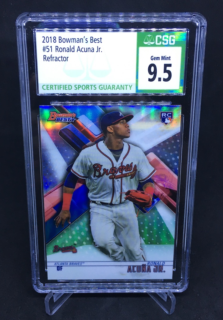The Reason Graded: Before Acuña was hurt last season I had a ton of his stuff I wanted to grade in a bulk sub ... but I went the prudent route and only did a few, figuring other people would probably be grading him due to his overall popularity. As you probably know from PSA's volume, the more popular a guy is can mean a ton of slabs -- and more volatile prices if there's a lot up for sale. Since this one was a Refractor parallel of a RC I sent it ... it looked clean and I figured his base RC might be graded more and be easier to land.