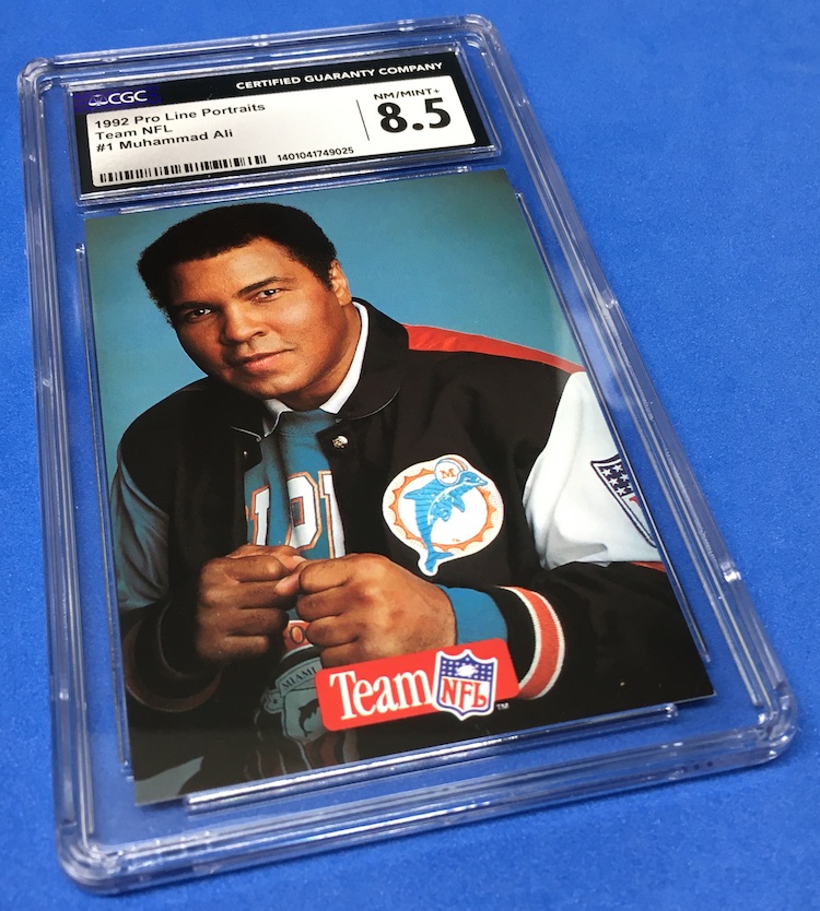 The Reason Graded: I'm a sucker for pretty much everything Pro Line the first few years and one of the most-unique cards among many is this insert showing the boxing legend in some Miami Dolphins gear. It's not that rare or that pricey -- but these inserts aren't in every box -- and this one looked super, super clean over one COMC so I grabbed it and slabbed it without seeing it in-hand.