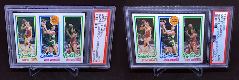 The Reason Bought/Graded: I must have deleted my records for this one -- or I might even have more than these two slabs floating around -- but it's a sign of how it goes for me with this oddity of a set showcasing a player I collect. I have noted here in the past how I grabbed a bunch of Johnson's cards from his career raw (1971-1981) in bulk with an eye for slabbing but with vintage that's just not something easily done to land stuff higher than a PSA 8 regularly ... even if you rip fresh packs. This weird three-cards-per-card set is an oddity that I have a love-hate relationship with. I like them a lot ... but would hate trying to chase high grades. An example of why? Check out the perforation lines for pulling these cards apart -- dramatically different on these two ... so much so I'm not even sure if that counts. One is rough enough that the cards would have close to 100-0 centering if they were pulled apart ... now that I think about it, both of these might have been buys. There's no way I would have sent the right one in with that perforation.
