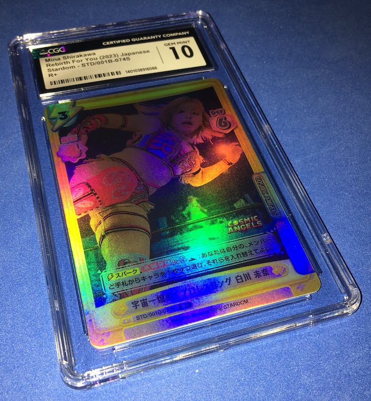 The Reason Graded: Photo-wise, the holographic foil surface here was a fight but, well, this Japanese star is a fighter who has in recent months made her way to American wrestling via AEW ... and that got this collector to look. Her BBM Rookie Card -- pre-Stardom promotion -- is a little pricey for me (I'll probably just buy one already slabbed if it presents itself) so I bit on this cheaper parallel card from a gaming-style set from Japan as a starter point.