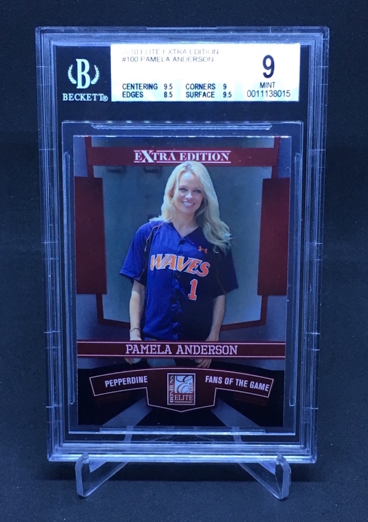 The Reason Graded: This is a baseball card -- the Baywatch star and 1990s icon is shown as a fan of the Pepperdine Waves baseball team -- and you can read all about the card's origins here. It's a fun story and a cheap card where the autographs and the parallels still get a lot more attention, but I thought this one would be a decent slab if in an elite grade. I submitted knowing that foilboard can be problematic and this card had one potential problem spot.