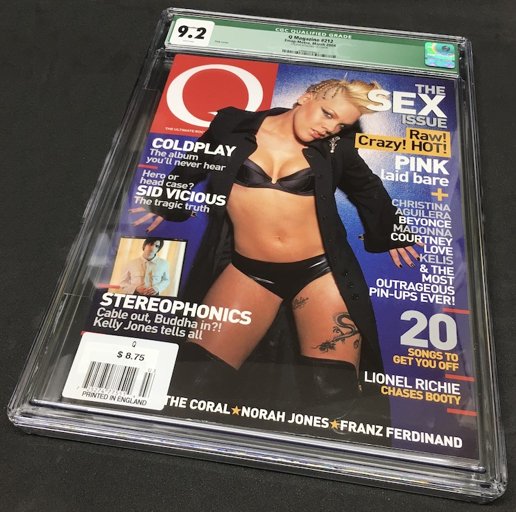 The Reason Graded: Buzz used to buy a boatload of the short-form pop culture mags like Blender, Maxim, Stuff, FHM and so on as their approaches to telling stories in short, readable forms meant there was a lot more variety of subjects inside those issues and the design work was way more creative, too. In later years where I lived in places with better bookstores I could find stuff like this, Q, which was the UK's main music magazine (it closed down in 2020) with that same approach but even more inside as international mags seemed to have a lot more editorial space and not as much advertising. I would regularly buy them if the subjects struck me -- and because they cost more as imports they didn't get thrown out as often. They cost more and felt more book-like to me and had better paper/ink, too. This was one of maybe a dozen issues I found revisiting some old stuff and since its slightly larger size was literally the max to fit in a slab I figured why not. Pink is among a number of top pop stars at that time and one of few still left in the game almost 20 years later still doing her thing. (Plus, off the top of my head, I can't think of any card appearances other than a couple of international gaming cards that touched on music stars of this timeframe.)