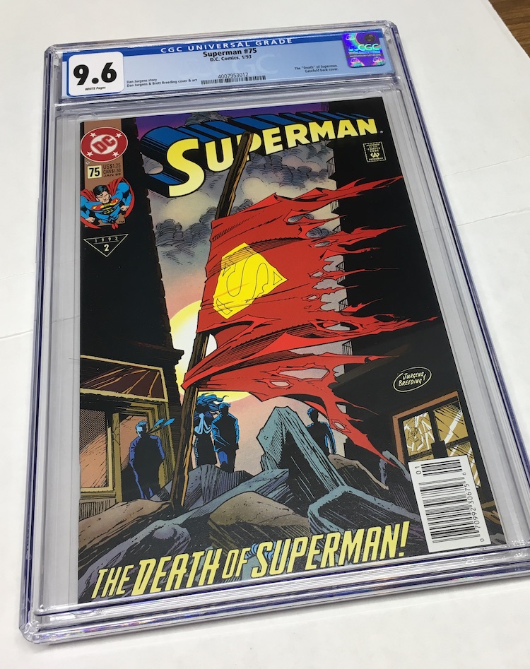 Reality Check: I was hoping for a 9.8 a that's where the money is at with these but a 9.6 is still respectable as there are plenty in low grades here. Why are the 9.8's the most-plentiful? Probably due to the volume of copies made -- there is a lot to cherry pick from -- though I still think the barcoded retail copies will be rarer in the long run. Those copies didn't immediately live bagged and boarded like the other guys for this red-hot book back then. This one sold more than six million copies and the main villain, Doomsday, has been seen pretty much everywhere else in TV and DC movies since. You'll see more of him here in the coming months.
