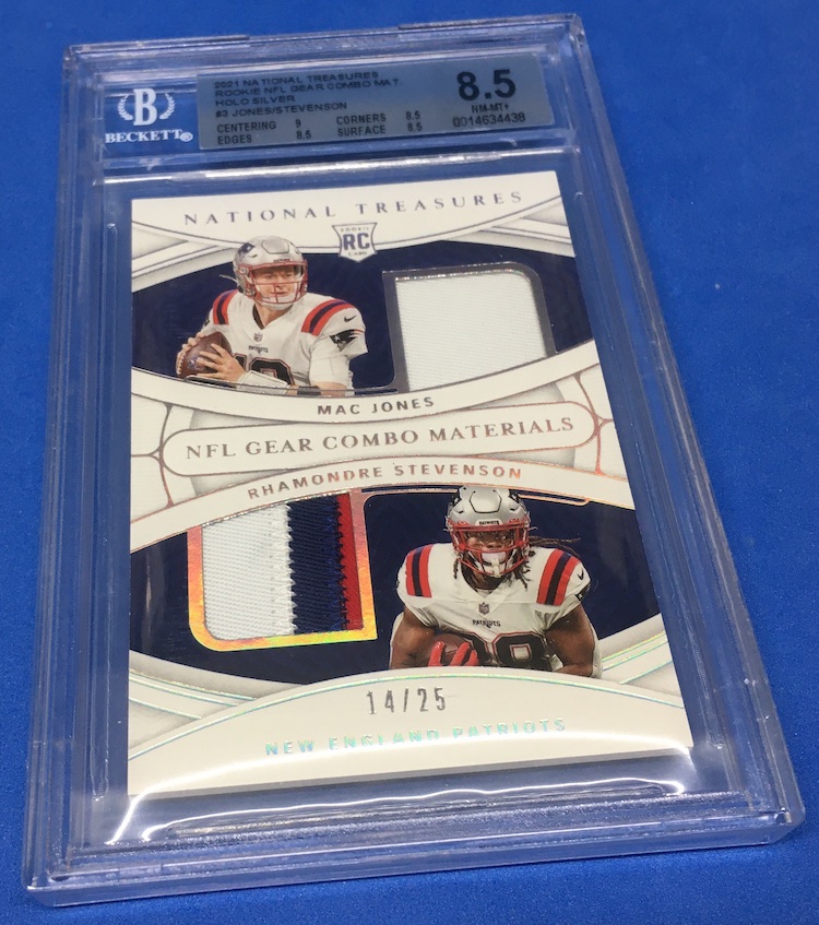 The Card: Mac Jones & Rhamondre Stevenson 2021 Panini National Treasures NFL Gear Combo Materials Holo Silver (/25)