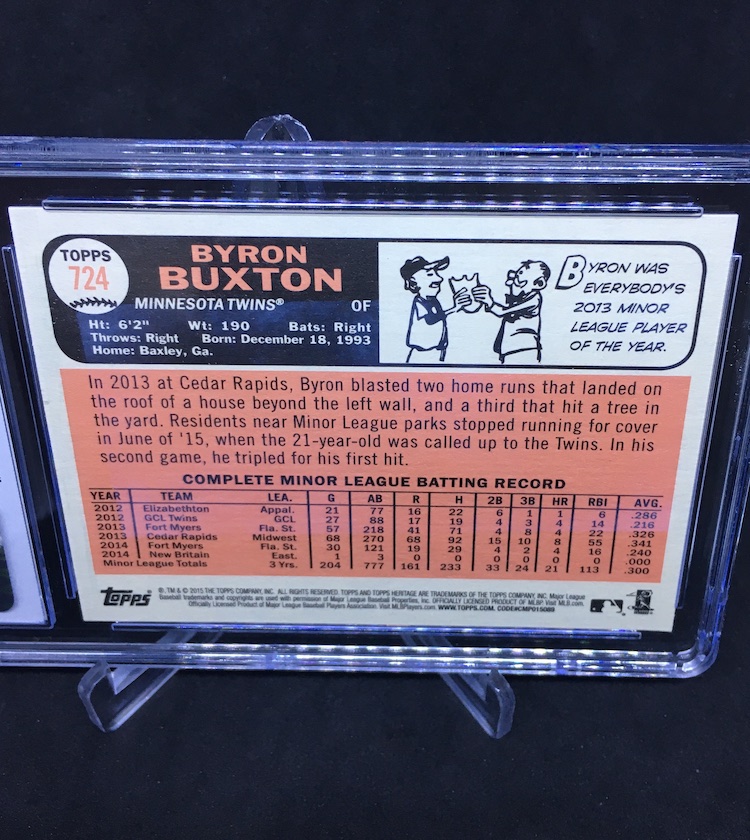 The Card: Byron Buxton 2015 Topps Heritage High Number Gum Stain -- Rookie Card parallel (botched label and maybe botched grade)