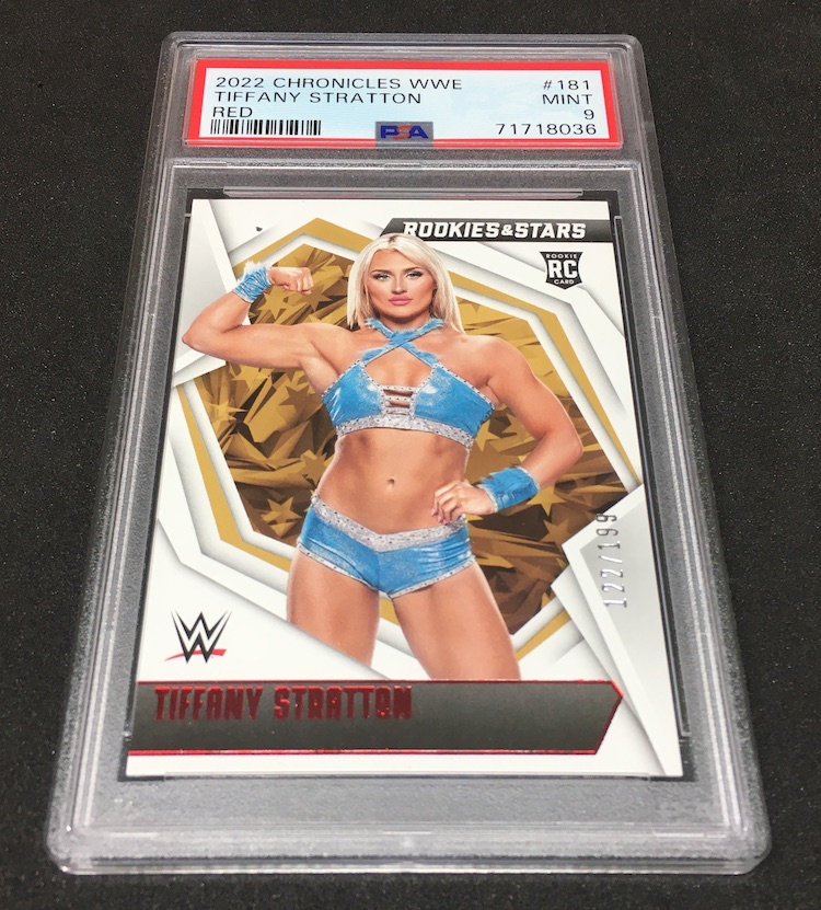 The Card: Tiffany Stratton 2022 Panini Chronicles WWE Rookies & Stars Red (/199) -- Rookie Card parallel