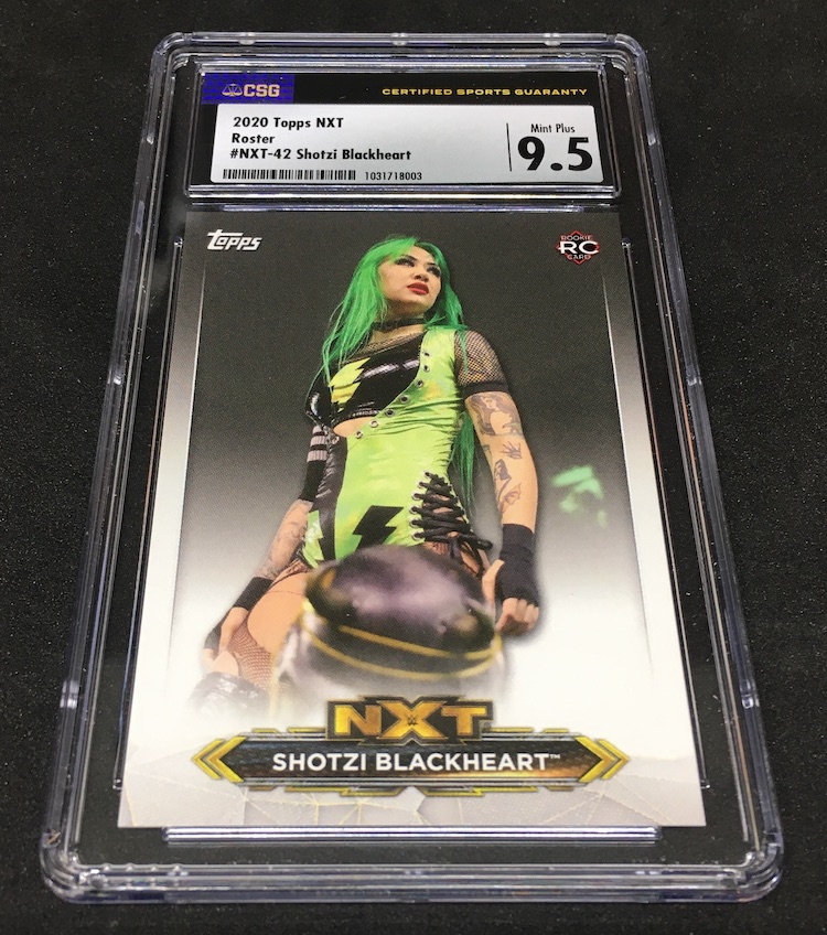 Reality Check: Mine checks in at the highest of a pair ... works for me. The centering seems to often be a culprit here and this one was very close to perfect ... but not. (By the way, her card in this one is a full-on Rookie Card as the NXT cards were part of the basic checklist for this release, not inserts like they were in the basic Topps set.)