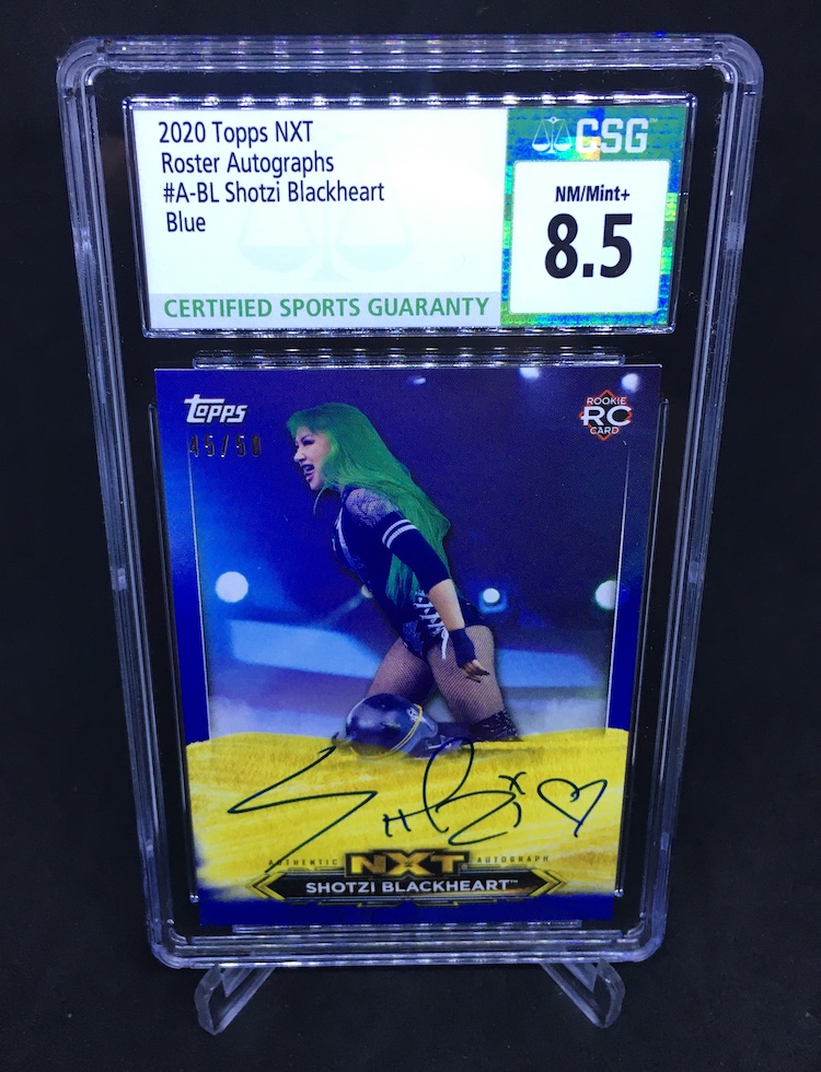 The Reason Graded: I'm a big fan of The Ballsy Badass' high-energy persona that used to include coming to the ring in a kids' tank wearing her horned military helmet that you can see a hint of in this photo. The stock used in this set is very problematic -- it always was in every year of Topps NXT cards -- but on-card sigs are worth it on stars' earliest cards, (And boxes were cheap, too.) I pulled this one from one of many boxes of this release that I opened (two autos per) and this is one of the cards she signed with extras. (A heart appears here and some have that and "TCB" for "Taking Care of Business.") The sig here is perfectly placed with each simple pen stroke quite visible and everything rich in color ... it's also a very clean sig that shows kind of a middle-style in its evolution. Her earliest ink (pre-WWE in 2019) is really rounded and curly almost like a graffiti-tagging style while autos after this are even more simplified and squashed for time since she's signing more stuff. This one shows the starts and stops for the letters perfectly and you can see those same motions replicated in her newer, quicker sigs.