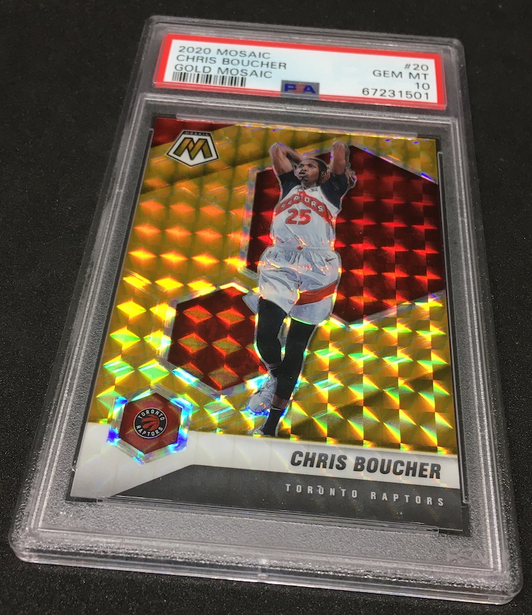 The Card: Chris Boucher 2020-21 Panini Mosaic Gold Mosaic parallel (/10)