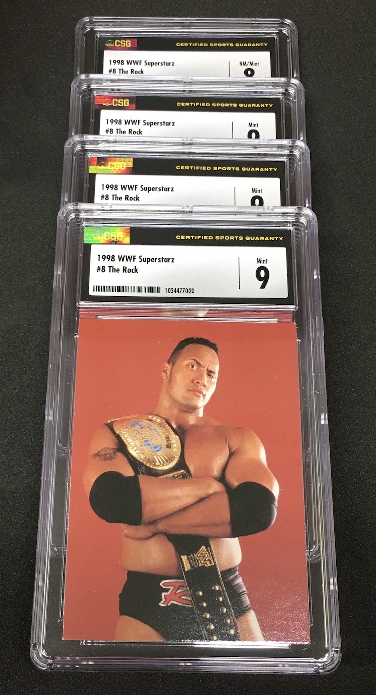 The Reason Graded: Like I said last month, I had a run of Rock RCs from opening a box and finding a set in an album I bought and I couldn't decide which ones to send ... so I sent them all. The glossed stock here is kind of soft and cuts can be rough but my copies of this card were a little cleaner than a lot of 'em I have from the set -- but they were getting graded no matter what. He has two cards in the base set -- this one in a small group of cards for stars who were champions at the time -- and I like this one more with a portrait and The People's Eyebrow raised. This is a quality card.