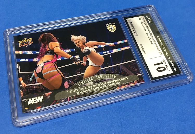 The Reason Graded: The Timeless One is an enigma in wrestling today -- or was it yesterday? -- and this newer card showcases her against a name back in AEW now on a full-time basis from Japan soon after some past matches, Mina Shirakawa. Shirakawa doesn't yet have AEW cardboard -- technically this isn't her card, it's Storm's -- but I grabbed and slabbed it anyway. Their three-pronged story with Mariah May (all previously worked in Japan) was a solid one for AEW last year.