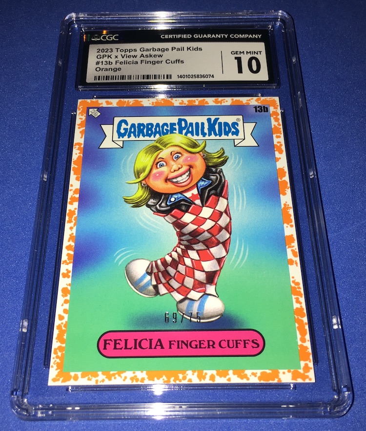 The Card: Felicia Finger Cuffs (aka Alyssa Jones in Chasing Amy ... aka Joey Lauren Adams) 2023 Topps Garbage Pail Kids x View Askew Orange (/75)