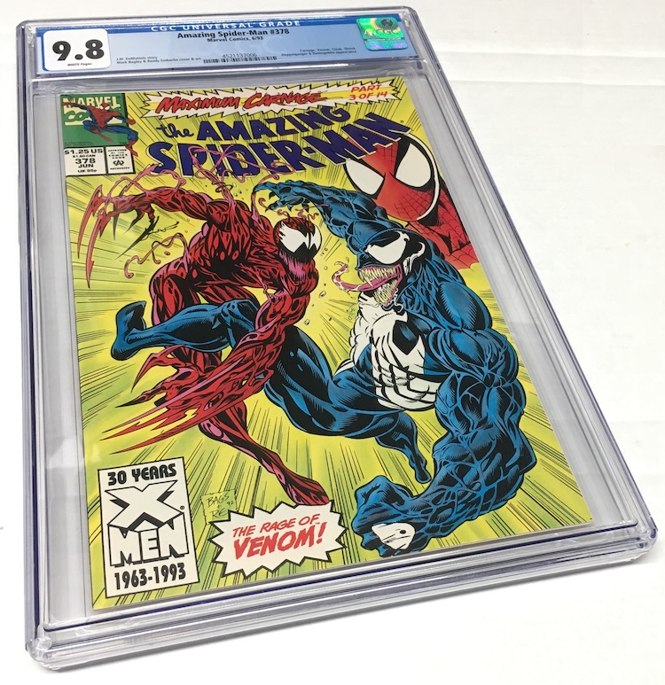 The Reason Graded: Oddly, this one is not a newsstand copy from my deep stash of rarer (at least in high grade) copies from a few years around this time. The introduction of Carnage (the red one) to go with Venom (the black one) and Spider-Man (the seemingly later-added one in this composition) was a reason that got me to pick off a few copies around this time but nothing in deep bulk like the X-Men/X-Force stuff. I really liked the visual here back then and figured this looked good enough to slab when revisiting boxes more recently.