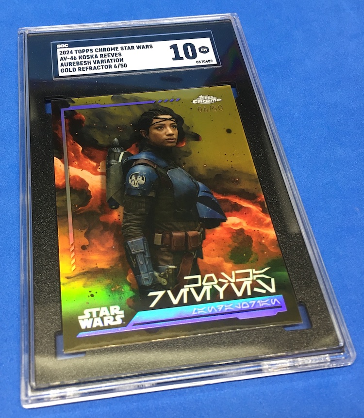 The Reason Bought: I landed this already graded for less than the cost of a blaster box despite it being a rarer parallel of a variation -- roughly one in 44 hobby packs or one in about 2,900 in a blaster. What's Aurebesh? A language in the Star Wars realm, of course. I used to regularly dabble with Star Wars stuff as it was findable and mostly affordable with a shot at some rarer interesting things ... but I've pretty much stopped ripping with the odds/SRPs combo not being all that friendly vs. values. (This slabbed card being an example.) I made an exception for this slab, which also goes with a new for Reeves that also tangentially are part of my wrestling card collection as she's a former WWE star and now an AEW (and other international promotions') champ.