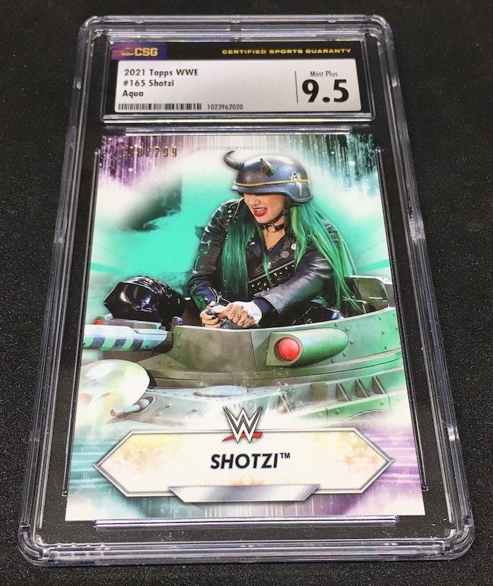 The Reason Graded: I collect this high-energy star to a decent degree and when I saw this card -- one of only a few with her famous Taking Care of Business tank during her entrances -- I knew I'd land one and slab it. Ideally, that means one of the parallels with the right colors -- Green or Aqua. My Green showed up with an oddly rough back top edge (watch those if you grade) so I sent in this one to join my army of Shotzi slabs. It's not pricey, but over time I intend to slab a bunch of her basics, some color and some ink. I've done a few so far and this is among the newer additions.