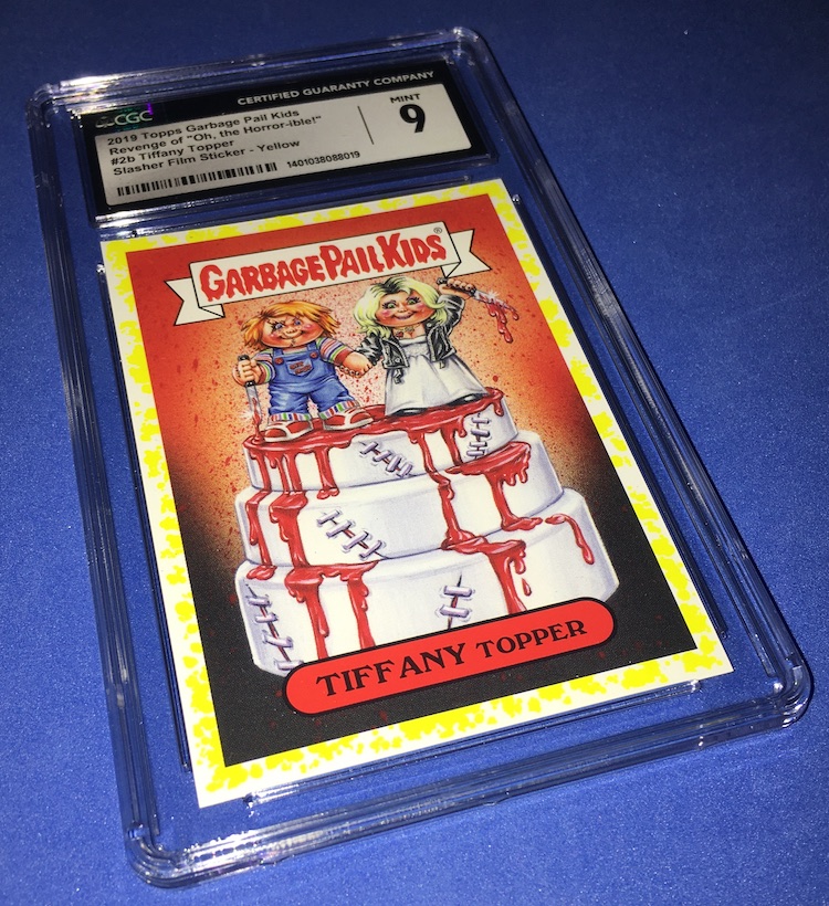 The Card: Tiffany Topper (Chucky & Tiffany from the Child's Play/Chucky franchise) 2019 Topps Garbage Pail Kids Oh The Horror-ible! Yellow parallel