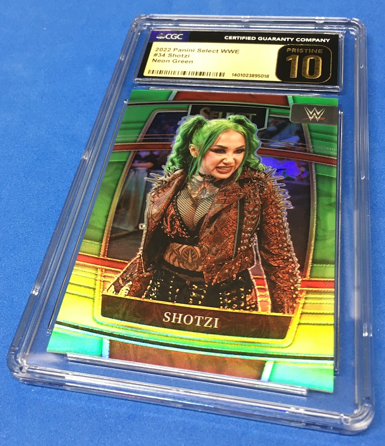 The Reason Graded: Green parallels are, of course, a focus for me for Shotzi -- at least when I can afford them -- and I did pony up a little for this card when I saw its perfect centering. Why? It seems like the entire product has left-right centering issues a heavy majority of the time, so this was an easy grading sub. Another reason why? I'm a collector of this colorful, high-energy WWE star and this card is on the rarer side of things from what is perhaps my favorite Panini WWE brand.