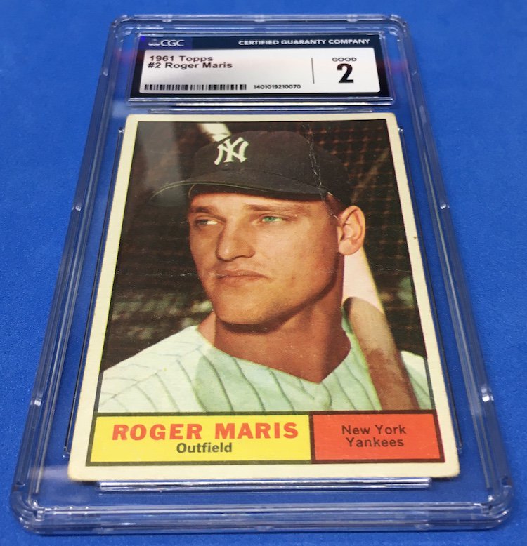 The Reason Graded: This is perhaps my favorite card of his -- from the summer where Maris hit 61 homers to pass The Babe and set a new MLB record -- and when I spotted this raw on COMC with a modest price I bit knowing that I would slab it and knowing that its grade would not be high. Why? Other than a faint line around his mouth, the image on this copy is very clean with the crease to the right also a big flaw but not one that makes the face look worse. Many of these cards can have issues that affect the face and bad centering if not snow across the whole image. Not this time, just other issues.