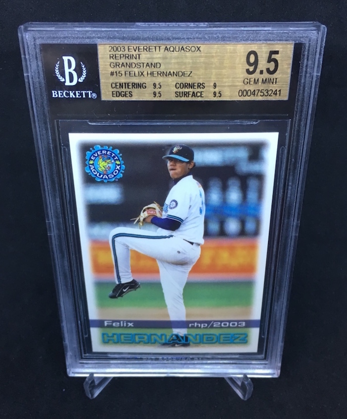 Reality Check: This mark is the only grade that this card has gotten, meanwhile the original has nothing higher but marks as low as a BGS 8 and five more copies in slabs overall. He'll go down as an all-time great for the Mariners and will probably be retiring at some point soon so that's another reason I might look at some of his stuff. I'm not sure there will be any dramatic bumps in his overall card values -- perhaps modest ones if you can find some bargains -- but I'll take the ironclad first card over any RCs in his case. (I pretty much have to say that after getting rid of all RCs that I had years ago.)
