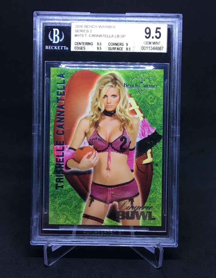 The Reason Graded: This former MTV Real World cast member has been on a number of reality shows since that time -- even one where she tag-teamed with WWE's The Miz -- but her only cardboard arrived from some BenchWarmer sets back in the day. This one was unique enough that I figured I'd slab and hold for football season ... so here we are. What's the deal with this card? Well, apparently she was the quarterback for the New York Euphoria -- the winning team in Lingerie Bowl III, which was a Super Bowl halftime counter-programming event in 2006. I had no idea these cards existed as short-printed base cards in one of the basic BenchWarmer sets until I was ripping into those dirt-cheap (and sadly gone) Eclectic boxes in the recent past looking for autos.