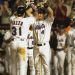 - FLUSHING, NY – SEPTEMBER 21: Third baseman Robin Ventura #4 of the New York Mets congratulates catcher Mike Piazza #31 after Piazza hit a 2-run home run in the eighth inning of the MLB game against the Atlanta Braves on September 21, 2001 at Shea Stadium in Flushing, New York. The Mets won 3-2. (Photo by Ezra Shaw/Getty Images)