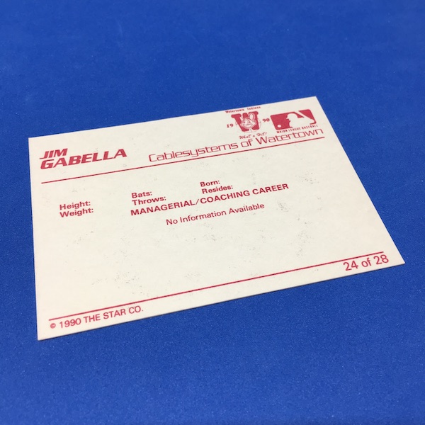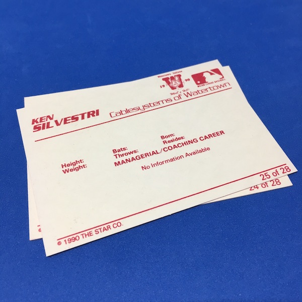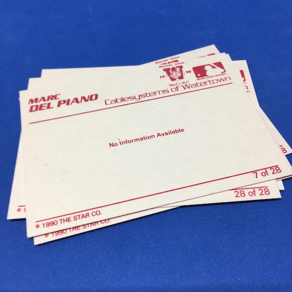 The Buzz On This: I didn't bother naming any of them and, well, I might not be alone in shorting these guys their cardboard due. I was going through a lot of admittedly bad cardboard from this one and was shocked by the run of "no information available" here in this set ... a six-pack of indifference or proof that a media guide was elusive or ... well, I dunno. The first two guys? No info ... not even a position. The G.M.? Must have been busy taking all other calls. The trainer, coach and manager? I could see them being busy ... but the last two had to have baseball resumes to get hired, right? It turns out DelPiano was a player, scout and even a Marlins VP before becoming a scout for the Yankees. The others have similar stories -- and you can find them at that linked site -- while Silvestri played eight seasons in the majors between 1939 and 1951 (just 102 games ... but that's probably more than you logged). He didn't play but was on the team when the New York Yankees won it all in 1941. ... Hey, at least Cablesystems of Watertown got their plug.
