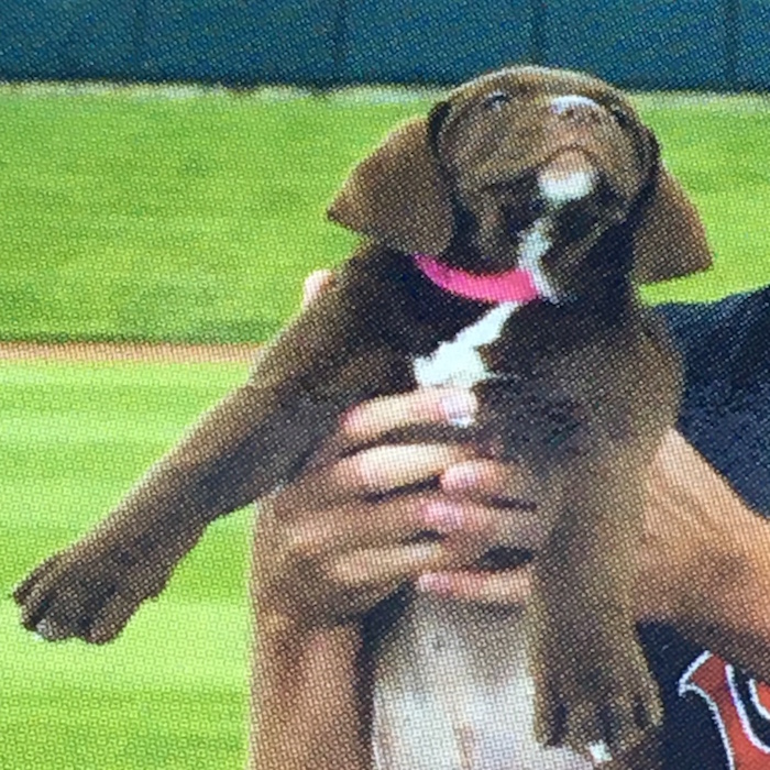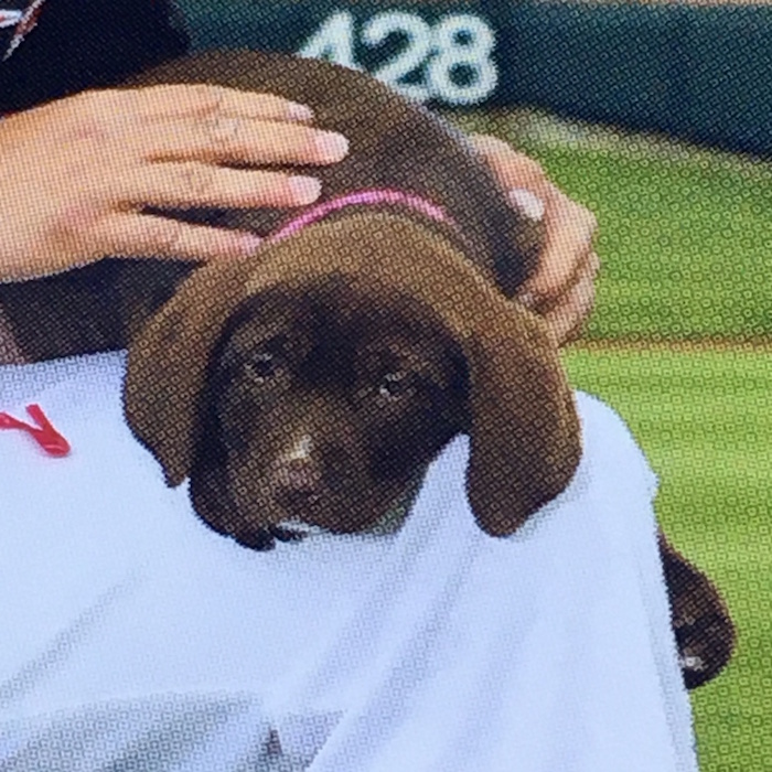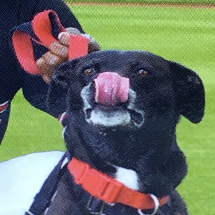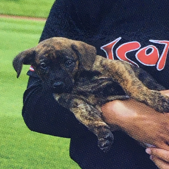 Why? It's not noted on any of the cards that I saw, but some Twitter discussions noted that it's a pink tarantula and all of this began with some kind of joke in spring training. (Update: Here's the back story.) Meanwhile, the pups were apparently from an animal shelter with some of the dogs stealing all of the attention on their cards. Some photos are simple grip and grins, some are football-style kneeling shots, some are young pups, some are with older furbbaies ... and some of them have furry All-Stars who appear on a few cards and are interacting with players like cardboard legends. Well, sort of.