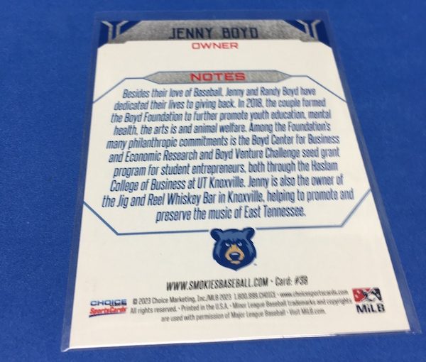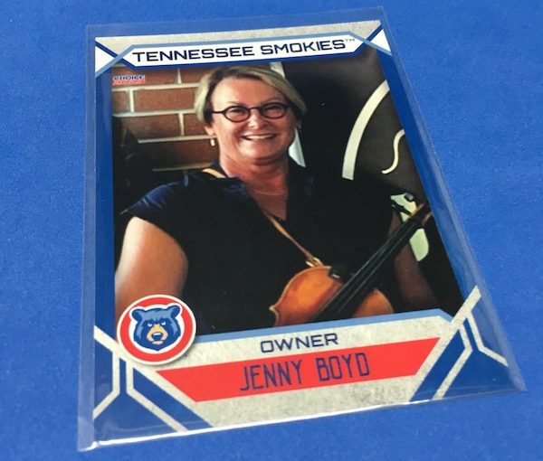 The Buzz On This: It's not totally unheard of to have a team owner pop up on MiLB baseball cards, and this one includes other facts about Boyd but barely touches on the musical instrument in her hands for the photo. Boyd owns a bar called "Jig and Reel" in the Old City of downtown Knoxville -- a musical Scottish pub. She and her husband, Randy, have all kinds of projects cooking beyond their baseball team.