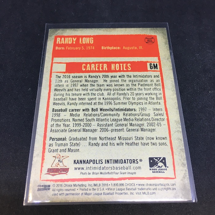 The Card: Randy Long 2016 Grandstand Kannapolis Intimidators #35