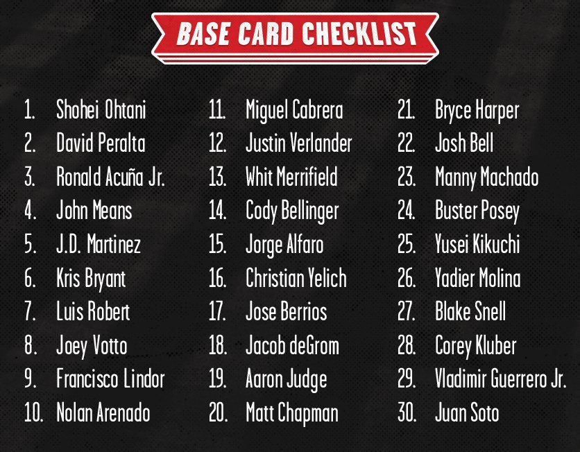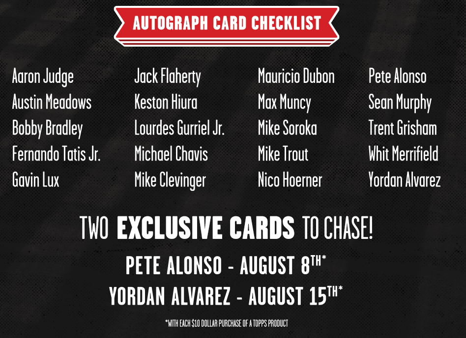 The NBCD set will consist of 30 cards featuring a number of notables -- including a Luis Robert Rookie Card as the only rookie presence -- and in those packs can also be cards from 20 signers, a list that includes Aaron Judge, Fernando Tatis Jr., Gavin Lux, Keston Hiura, Trout, Alvarez and others.